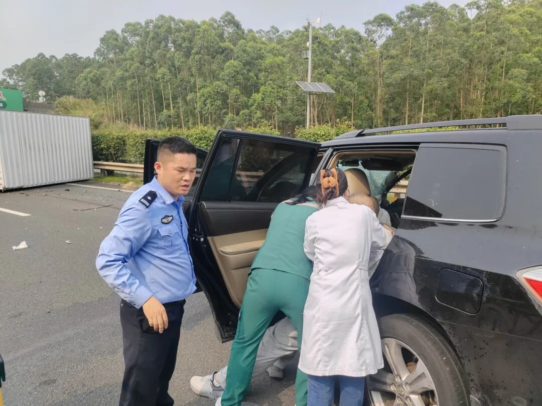 从南宁驾车返程的北海监狱六监区监区长吴晓远途经现场,他没有丝毫犹豫,迅速将车停至安全地带。情况紧急,交警和消防人员都还没到现场,为了更好地指挥交通,避免二次事故,他换上了车上的警服,下车查看现场状况,在距离事故车辆后方150米处摆放三角警示牌,同时拨通110、119报警,说明事发位置、危化品种类、燃油泄漏情况、被困人员数量与伤情态势,为后续救援力量精准研判提供了关键信息。
