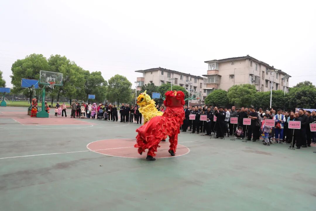 篮球场上,喜庆热闹的舞狮表演点燃了观众热情。