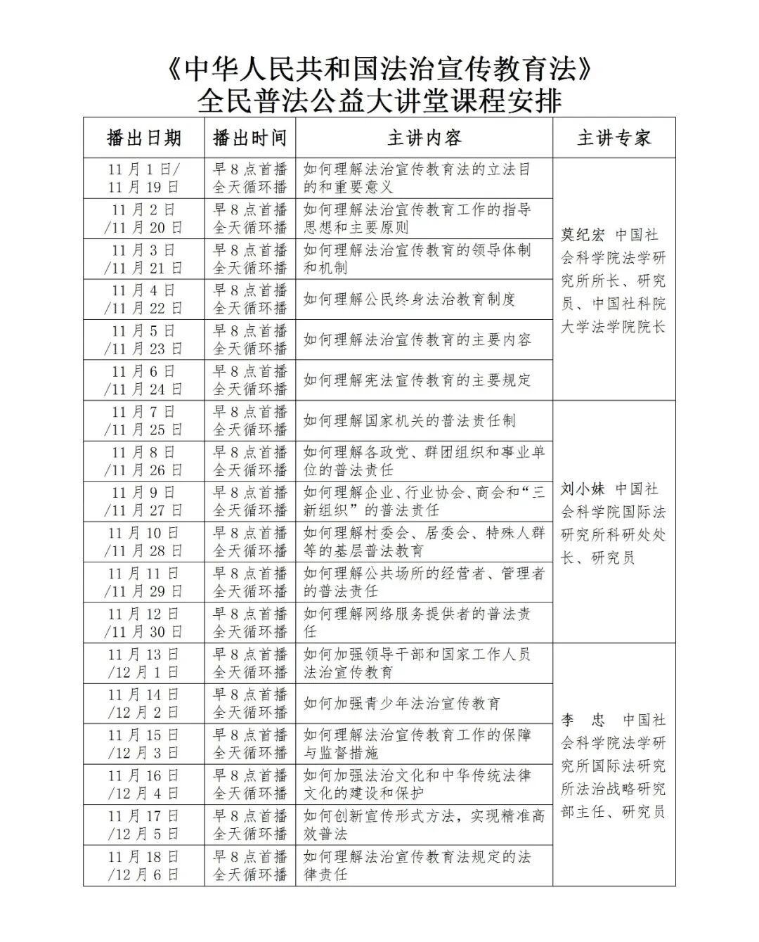 2025年9月12日,十四届全国人大常委会第十七次会议表决通过《中华人民共和国法治宣传教育法》,自2025年11月1日起施行。为学习宣传《中华人民共和国法治宣传教育法》,进一步推动依法普法、全民学法,自治区司法厅联合中国社会科学院法学研究所法宣研究中心组织开展《中华人民共和国法治宣传教育法》全民普法公益大讲堂活动。有关事项如下: