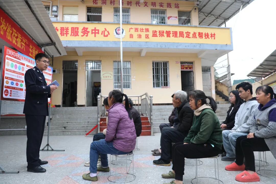 近日,鹿州监狱到罗城仫佬族自治县东门镇佑洞村开展“普法惠民强根基 党建护航促振兴”主题实践活动。通过座谈交流、实地帮扶、普法宣讲、慰问暖心等形式,把法治保障、组织温暖送到群众心坎上,为乡村全面振兴注入强劲动力。
