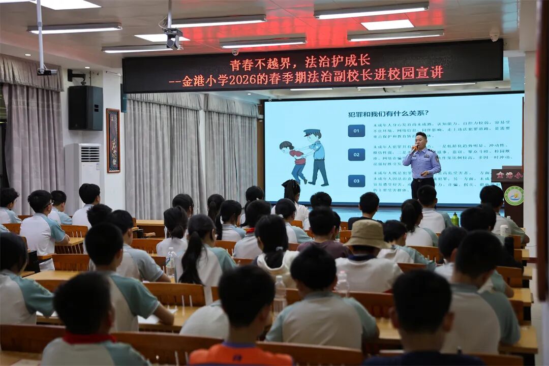 在金港小学,法治副校长围绕未成年人保护法、预防未成年人犯罪法,结合真实案例明确行为边界,讲解不良行为法律后果与法律求助渠道,有效提升学生的法治意识与安全防护能力,助力构建和谐平安校园环境。